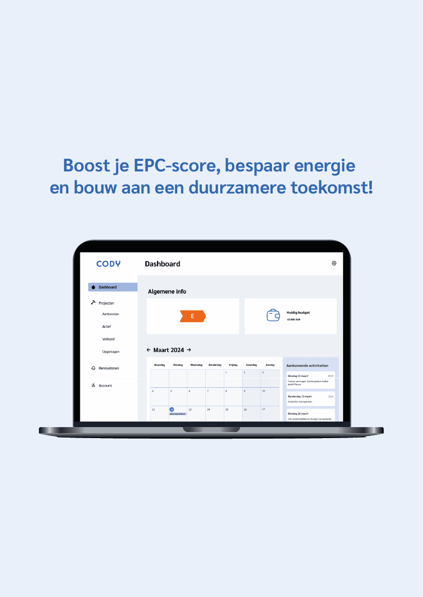 For my bachelor’s thesis, I focused on EPC (Energy Performance Certificate) labels. Together with my team, I developed an app (Cody) that helps users plan and track their renovations, allowing them to monitor their progress toward achieving a better EPC label.